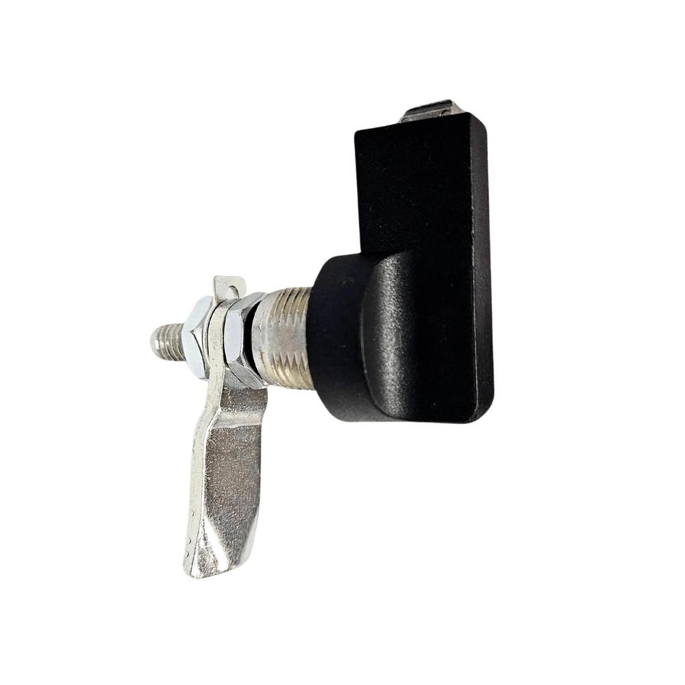 Manopla e anel em poliamida preta. Bucha, lingueta e porcas zincado trivalente branco.