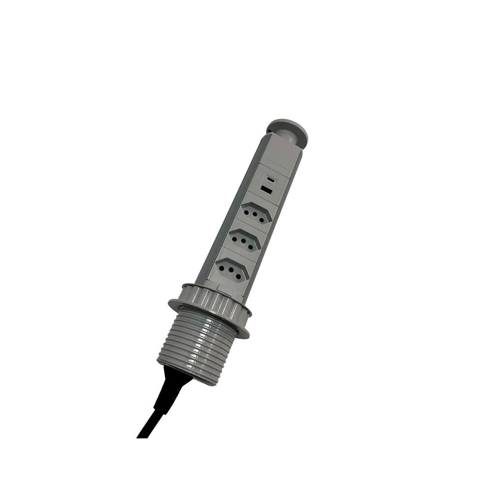 Mini Totem Manual é um produto com abertura através de push pull que acompanha 3 tomadas de 20A + 2 USB com fácil instalação evitando o rompimento e quebra de fios e cabos internos, uma segurança extra contra acidentes como choque ou curto circuito. O material é feito de alumínio e termoplástico. Dispensa mão-de-obra especializada para a instalação, basta ter uma serra copo na medida da base do totem.